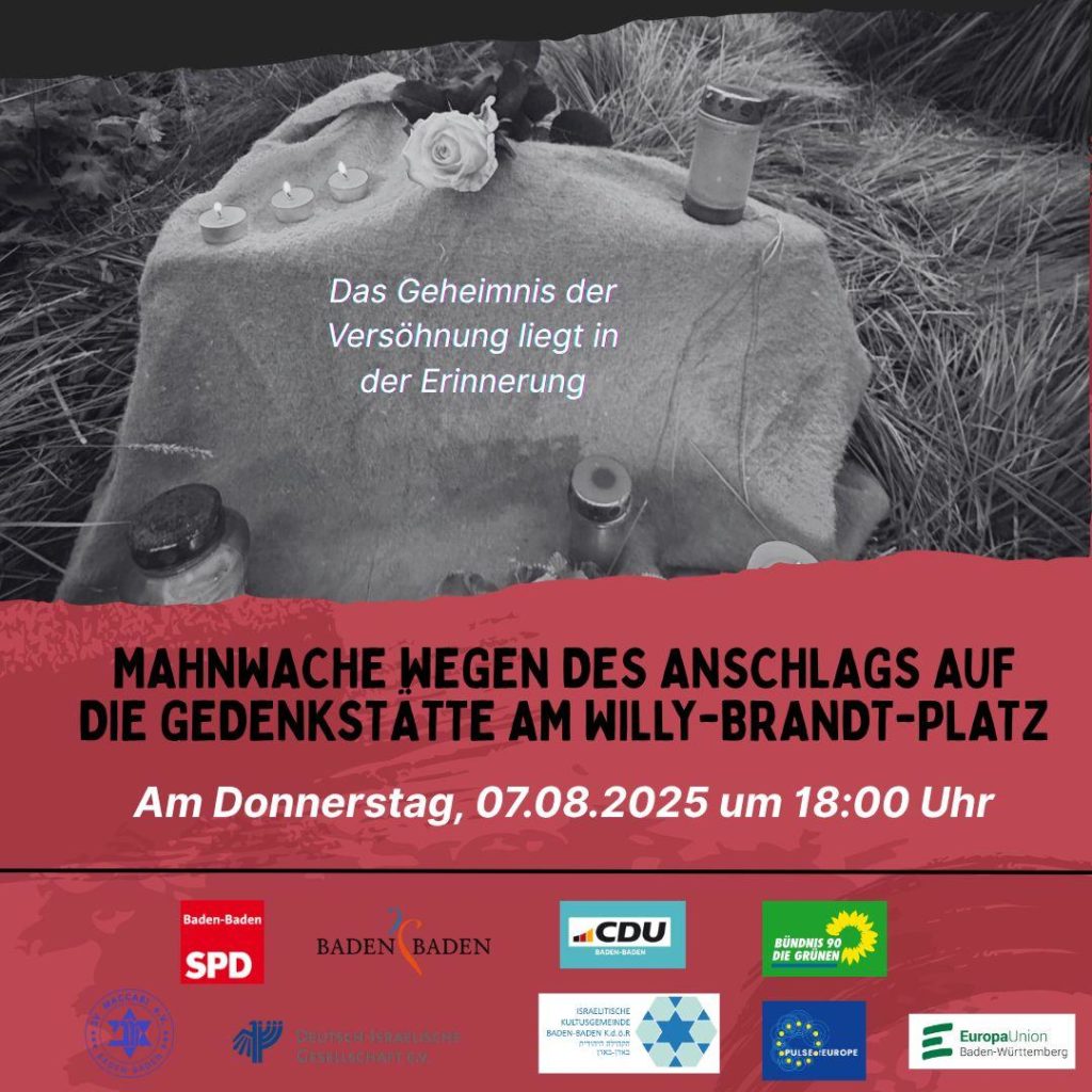 Gemeinsam mit der Israelitischen Kultusgemeinde Baden-Baden und weiteren Vertretern der Baden-Badener Stadtgesellschaft (Stadt Baden-Baden, CDU, DIE GRÜNEN, SPD, Maccabi, Europa-Union und Pulse of Europe) rufen wir am Donnerstag, 7. August 2025, um 18 Uhr zur Mahnwache auf.